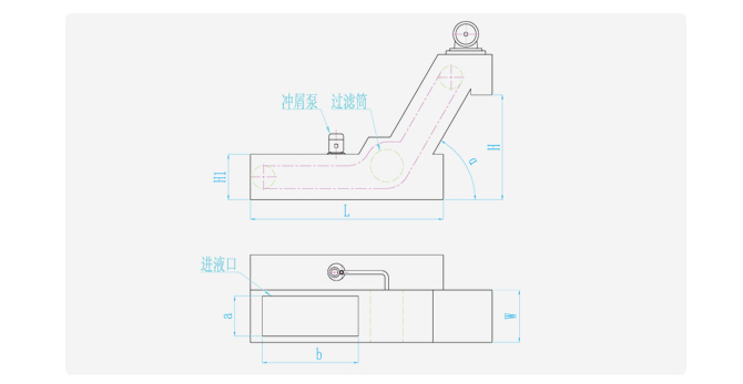 當(dāng)機(jī)床切屑隨著冷卻液進(jìn)入本裝置時(shí),較大的切屑沉到機(jī)器底部由刮屑板刮出,細(xì)小顆粒混在冷卻液中,隨著冷卻液通過(guò)旋轉(zhuǎn)過(guò)濾筒過(guò)濾器時(shí),堵塞在過(guò)濾筒外的過(guò)濾網(wǎng)上。由于過(guò)濾筒過(guò)濾器是不斷旋轉(zhuǎn)的,堵塞在過(guò)濾網(wǎng)上的細(xì)小顆粒經(jīng)過(guò)反沖清洗系統(tǒng)的沖洗落到機(jī)器底部也由刮屑板刮出。同時(shí)經(jīng)過(guò)過(guò)濾的冷卻液流入凈液箱,再由液泵泵到主機(jī)上。