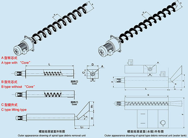 ZDLX系列螺旋排屑裝置是由減速機(jī)、螺旋體及殼體三部分組成。通過減速機(jī)驅(qū)動(dòng)螺旋體轉(zhuǎn)動(dòng),與殼體產(chǎn)生相對(duì)運(yùn)動(dòng),從而將切屑沿殼體軸向推出。根據(jù)使用情況,結(jié)構(gòu)形式可分為: