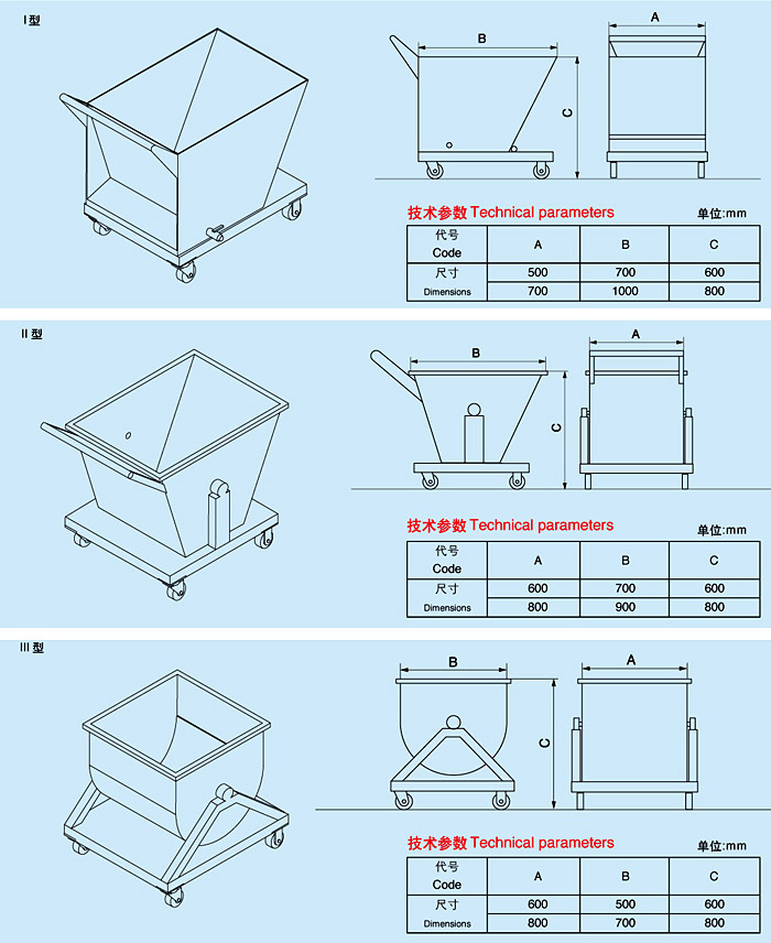 ●JXC 型集屑車(料斗)用于收集各種機(jī)床排屑裝置傳送下來的各種切屑,集屑車(料斗)底部裝有腳輪,可將切屑送出工作場地,便于集中清理。集屑車(料斗)分為干式與濕式兩種,干式料斗可以傾斜,將切屑倒出即可,濕式是在干式基礎(chǔ)上加過濾板,放液閥,便于切屑中的切屑液與切屑分離起到回收環(huán)保作用。可根據(jù)不同排屑量,不同用戶的要求.設(shè)計(jì)各種容積、功能的集屑車(料斗)。